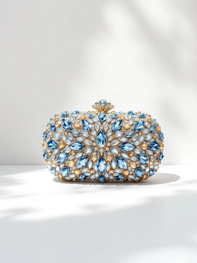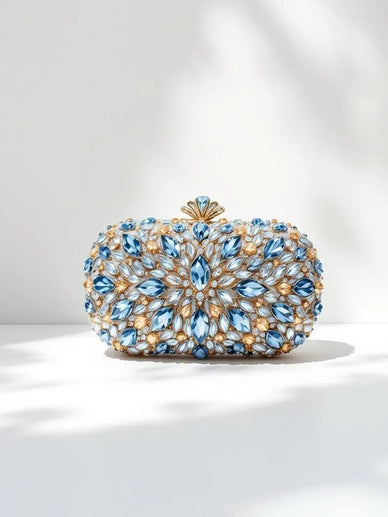A gold-hued clutch encrusted with cubic zirconia for a radiant, luxurious finish. Comes with a detachable chain strap.