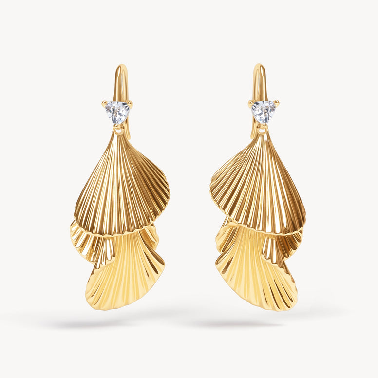 The Petal Drop Earrings bring a fresh perspective to floral-inspired design. Crafted from 14k gold-plated sterling silver, these 44mm-long earrings feature freely moving petal-like forms that catch the light with every step. A triangular white cubic zirconia adds a refined focal point, while the hook design ensures effortless wear. Perfect for adding modern movement and dimension to your style.